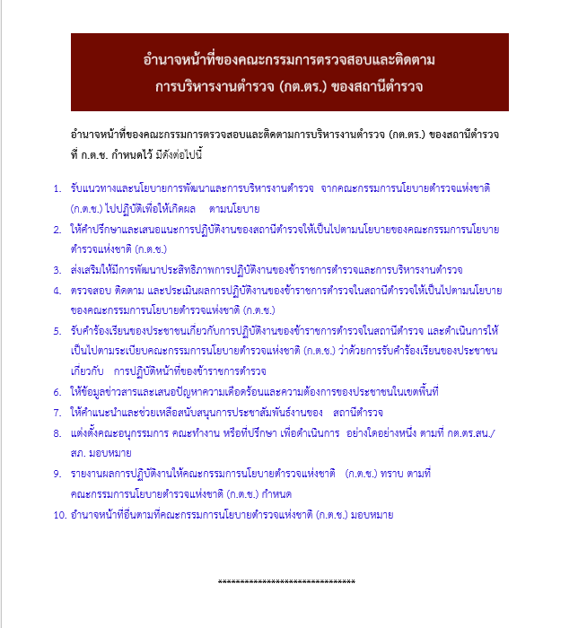 Home » มาตรฐาน ITA » ตัวชี้วัดที่ 9 การเปิดเผยข้อมูล » ตัวชี้วัดย่อยที่ 9.1 ข้อมูลพื้นฐาน » ข้อมูลพื้นฐาน » O4 ข้อมูลคณะกรรมการตรวจสอบและติดตามการบริหารงานตำรวจ (กต.ตร) ของสถานีตำรวจ